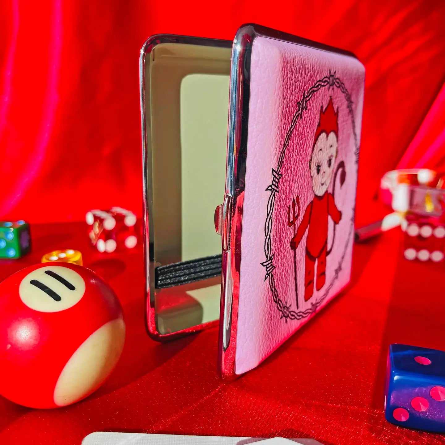They're baby!!! This cutie case is perf. We love this case because it's a little slimmer than our classic boxy glittery pink version and being that it's not see thru, it's a bit more discreet! The art on this case is made by us! One side features a kewpie angel and the other features a kewpie devil ❤️🔥 Also perfect for cash, cards, lip gloss, whatever else fits! Measures 3.75" x 3.75" x .75" Box does not include any products featured in photos and will arrive empty.