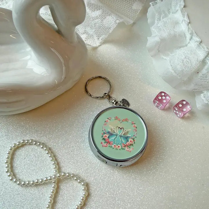 We're swooning over these swans! This beautiful design is serving Swan Lake vibes! Pop it open to reveal a cute little built-in cig rest - adorable!! Featuring two swans in a darling floral heart, it's sure to look fabulous on any keychain or bag! Comes on a split-ring keychain for easy attachment. This listing is only for the swan ash tray keychain, no other accessories pictured. Ash tray measures 2" x 2" x 0.75" Made of Iron and Nickel. For tobacco use only.