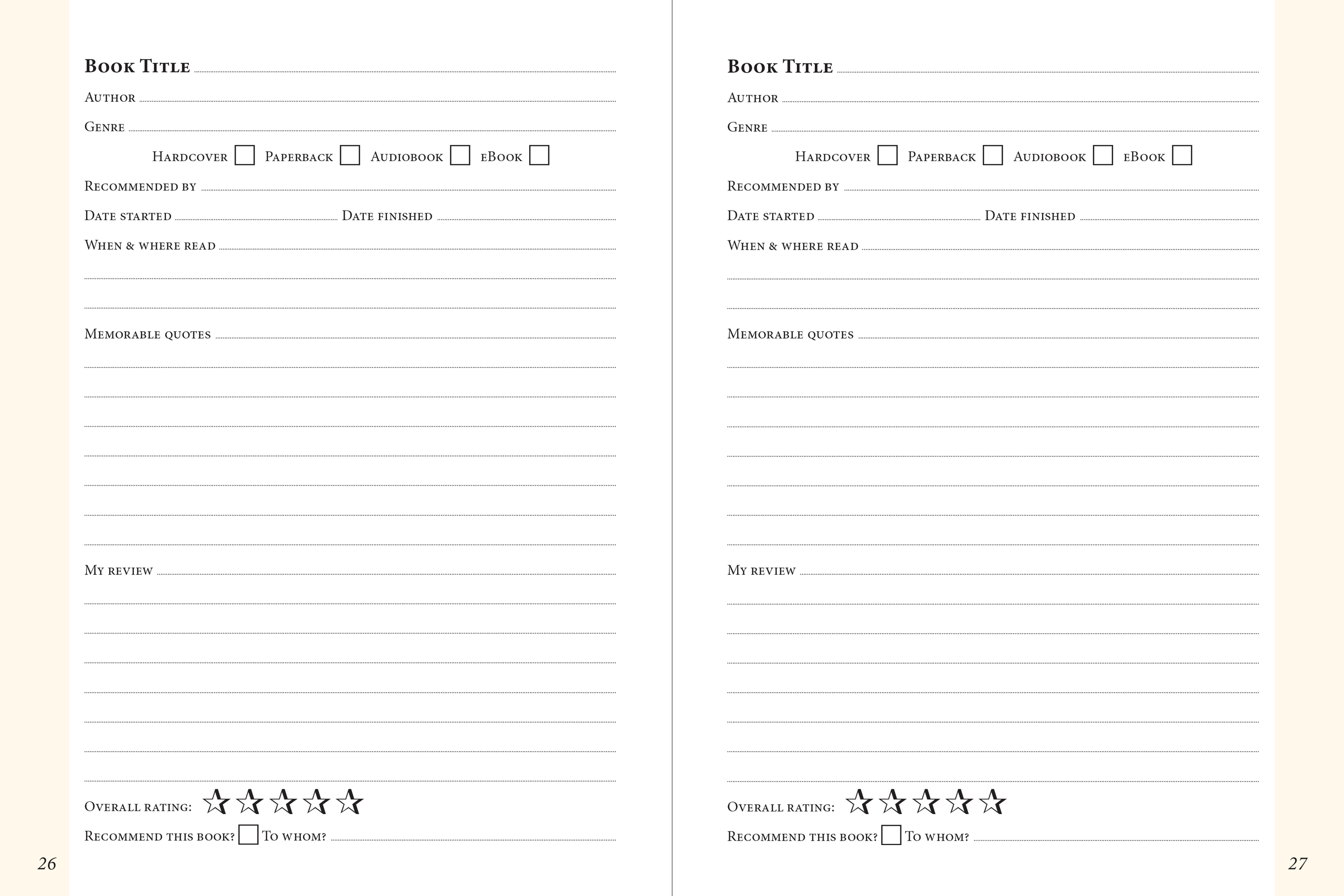 Read, record, and review 100 books in this elegant journal! Space to note up to 100 books you want to read next! Track books you've borrowed, lent, given, and received. Reflect on your literary journey, from childhood to today. Archival-quality, acid-free 120 gsm paper preserves your entries for years to come. Lightly lined pages gently guide your writing. Durable bookbound hardcover ensures longevity. Comfortable size: 6-1/4'' wide x 8-1/4'' high, perfect for writing. Comes with a matching ribbon bookmark to keep your place. 160 pages in which to capture your literary life!